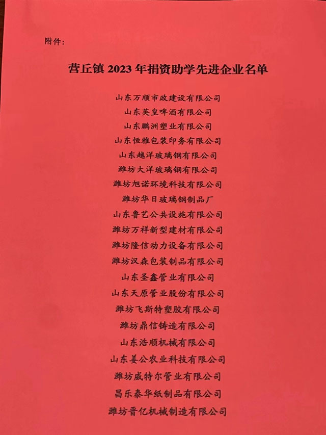 2023年8月9日上午,山东越洋玻璃钢有限公司受邀参加昌乐县2023年金秋助学会议。县委书记王骁出席并讲话,县人大常委会主任张金涛参加。